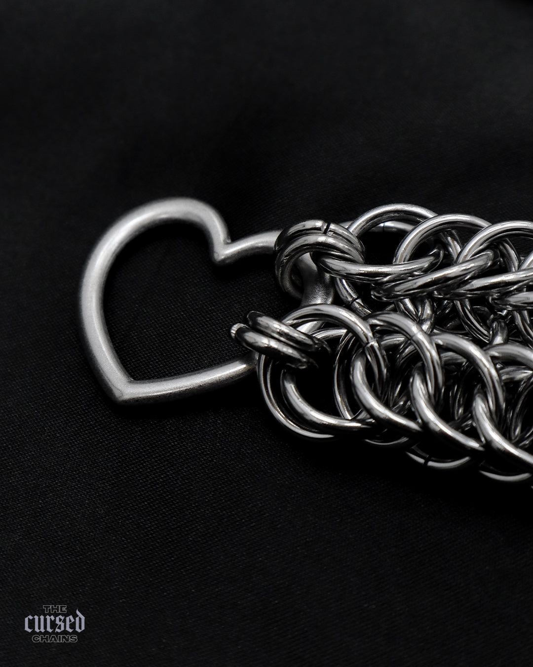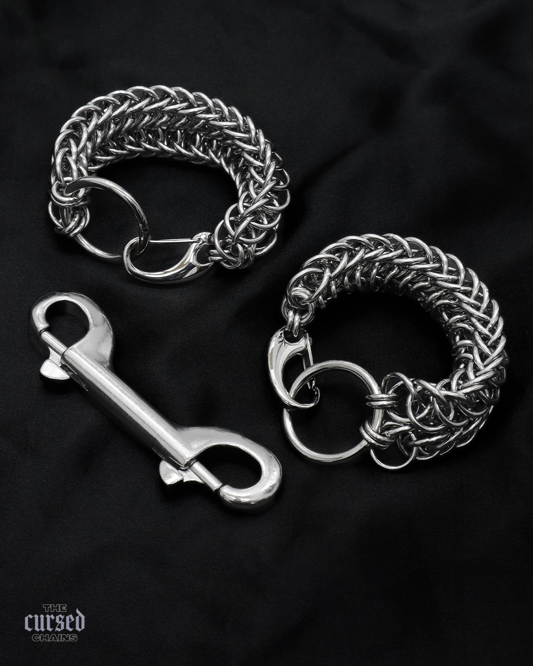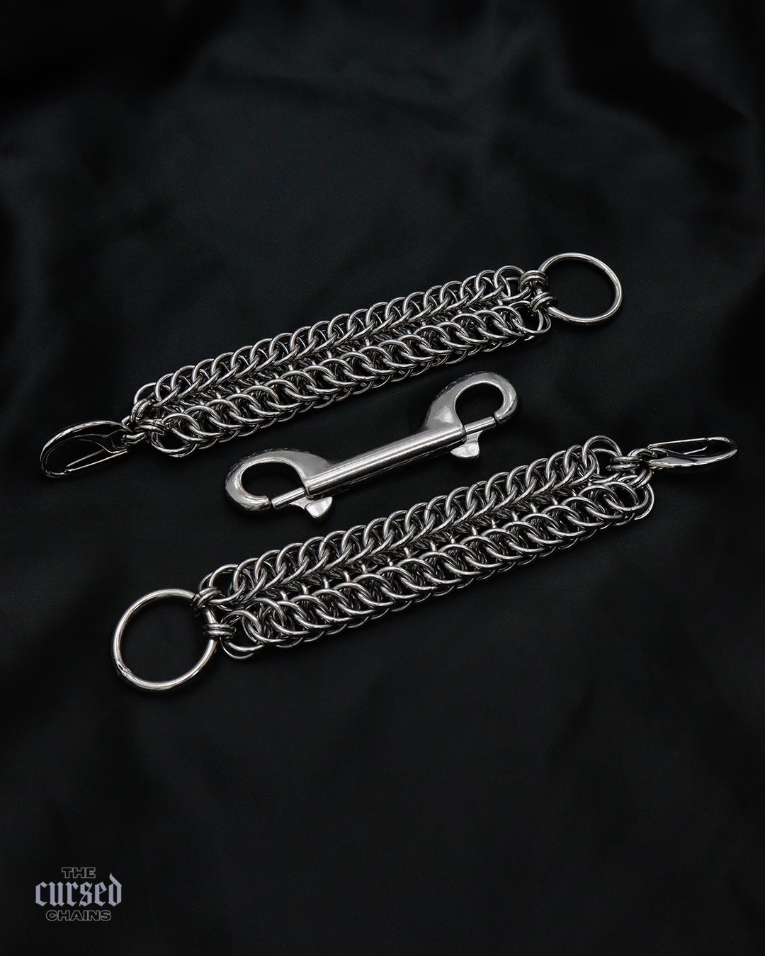 Leur design unique en cotte de maille évoque la tension, tandis que les anneaux centraux permettent d’y attacher un mousqueton double, élément central pour entraver les mouvements de ton/ta partenaire... ou les tiens.