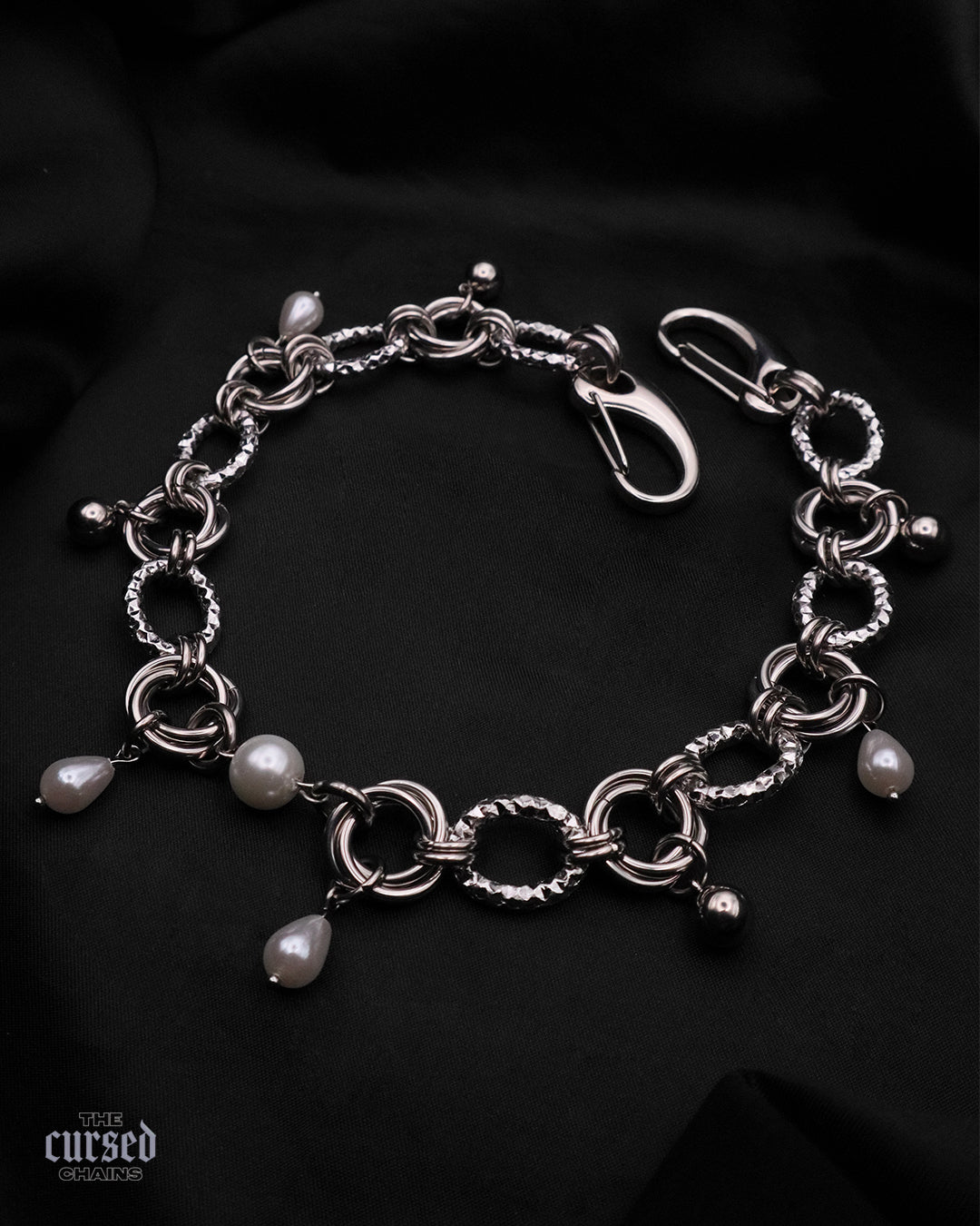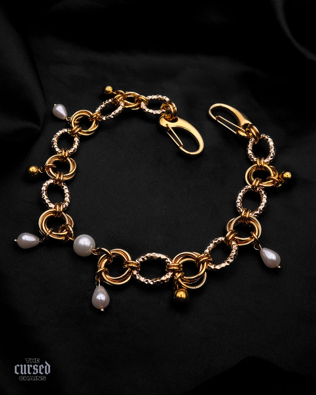 Les anneaux massifs de ce bijou contrastent avec la finesse des chaînes et la douceur des perles nacrées.